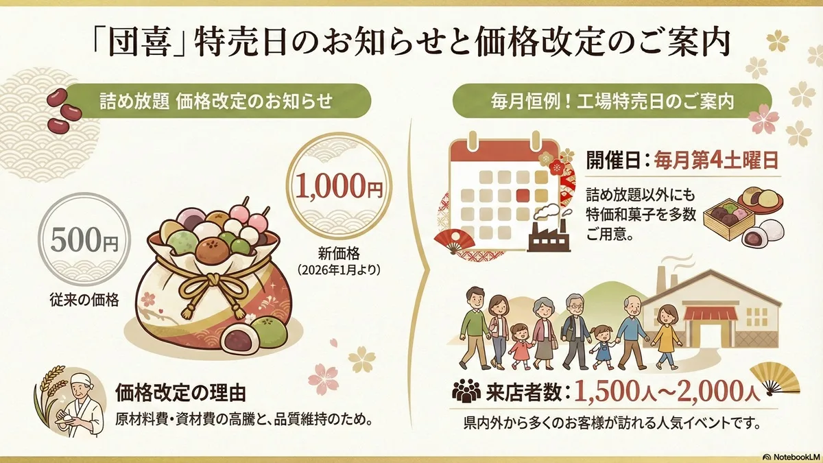 滋賀県大津市和邇にある和菓子メーカー「株式会社 団喜」が、毎月開催している恒例の特売日について新たな情報を発表しました。これまで多くのファンに親しまれてきた名物企画の内容に変更が生じるため、その詳細についてお伝えします。