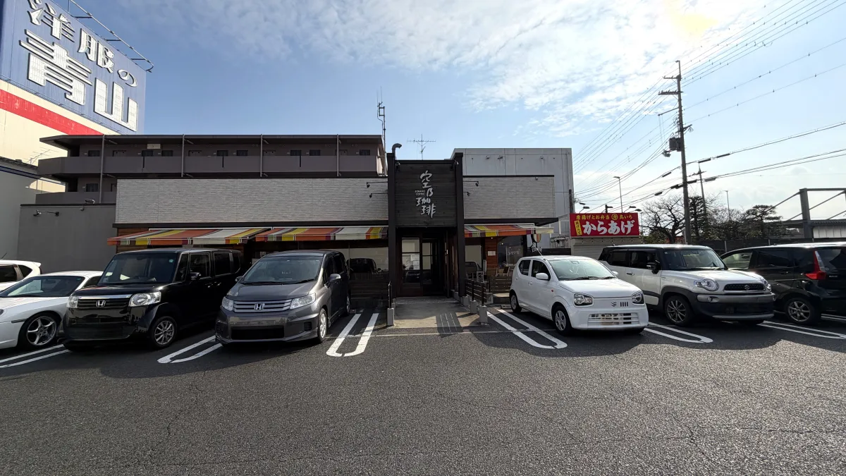 滋賀県草津市野村に店舗を構える「空乃珈琲」は、その名が示す通り、広大な空の下で寛いでいるかのような開放感をコンセプトとしたカフェです。店内は天井が高く設計されており、テラス席も設けられているため、閉塞感とは無縁の心地よい空間が広がっています