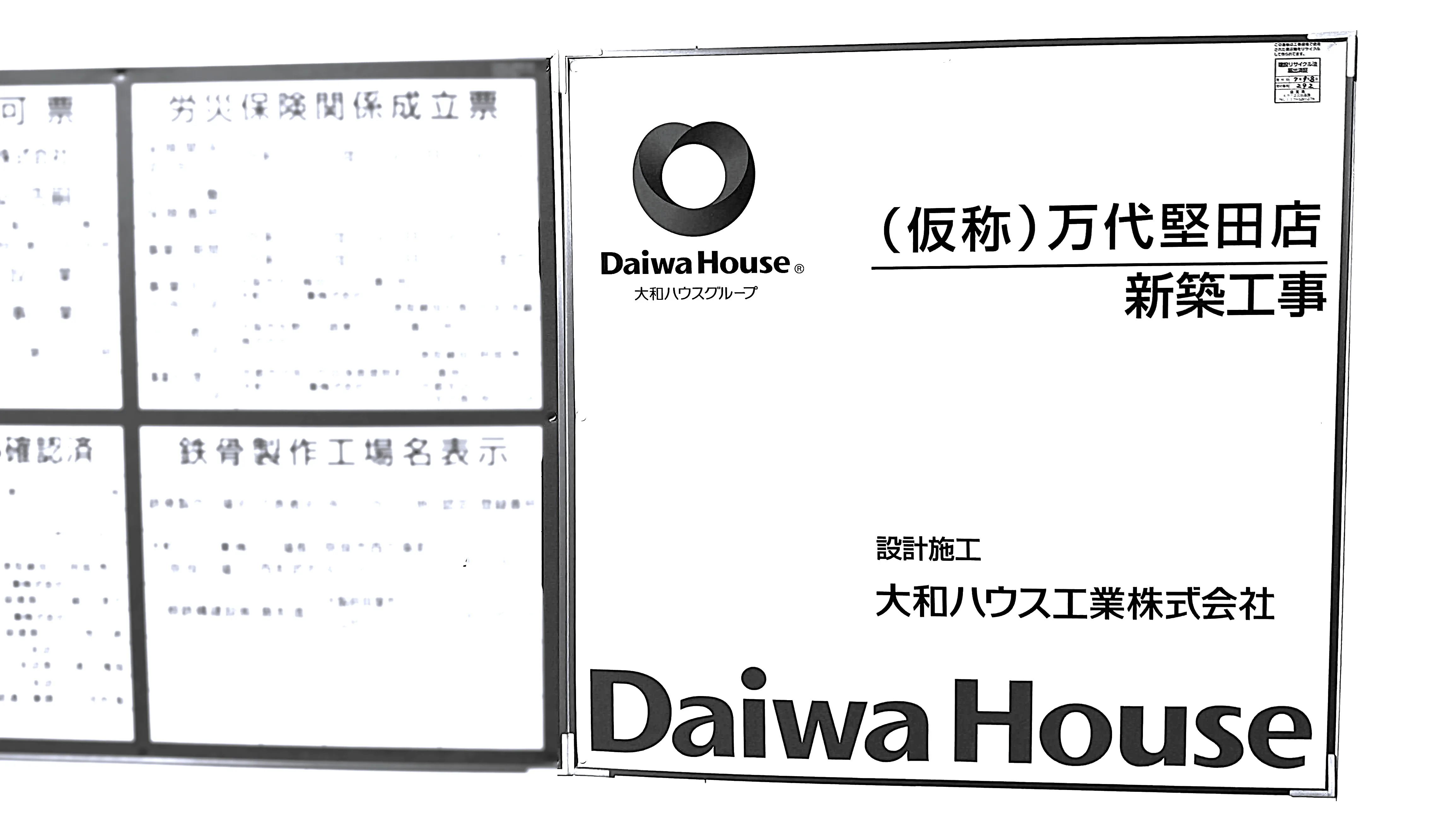 ▲工事現場の掲示板には「(仮称)万代堅田店新築工事」と記載