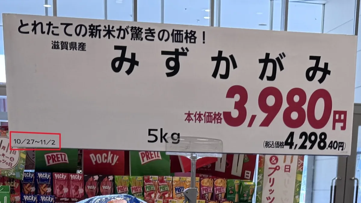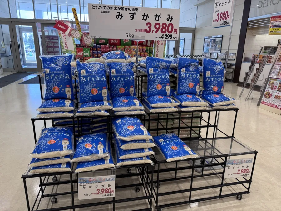 撮影日は2025年11月1日。 店頭には「滋賀県産みずかがみ 新米」と書かれた袋がずらりと並び、ツヤのある粒が印象的でした。 販売価格は5㎏で3,980円(税込4,298円)。 日頃、いろんなスーパーを巡っている私でも、滋賀県産ブランド米が4,000円以下で販売されているのはほとんど見かけません。