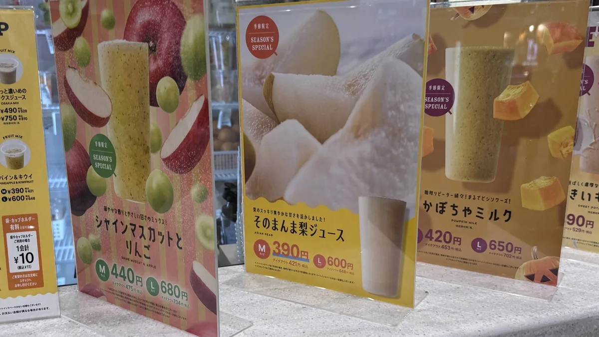 激ウマの甘い梨ジュース&温州みかんジュースを2つとも飲んでみた【イオンモール草津 果汁工房果琳】