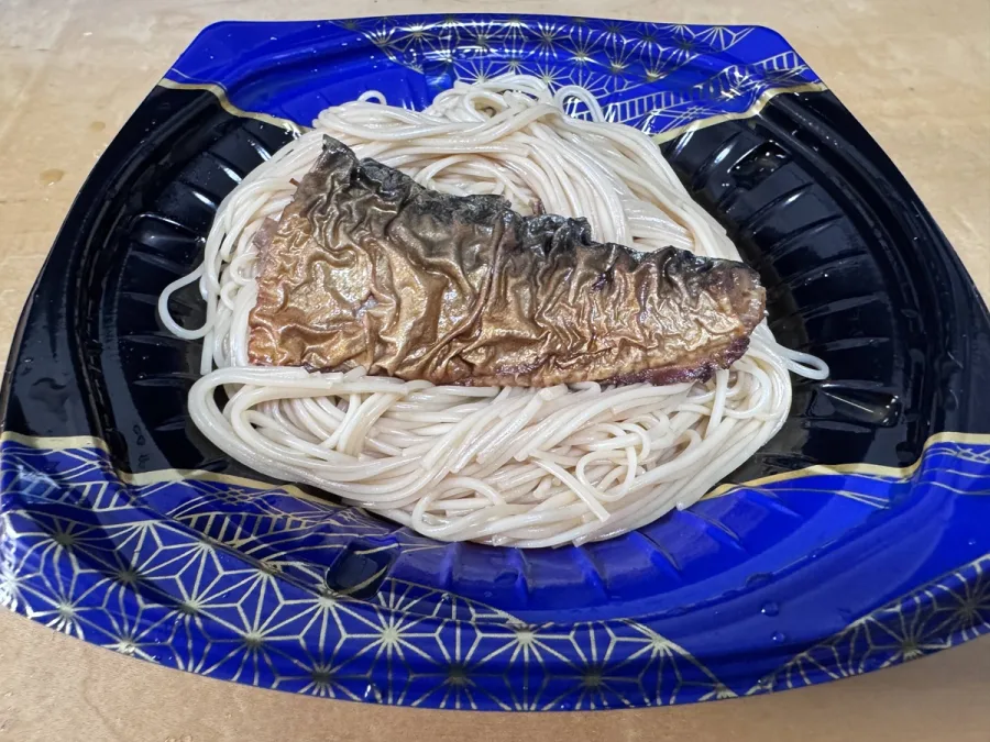 - 【特徴】焼き鯖の甘辛煮×茶色に染まったそうめん、山椒付き